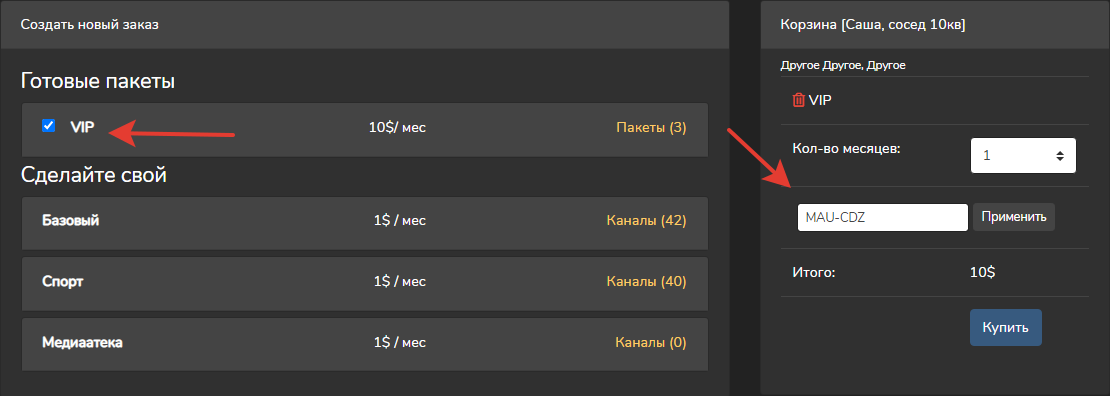 3. На странице создания заказа выберите желаемые пакеты, например VIP. В специальном поле введите код вашего купона, как показано на картинке (на изображении приведен пример промокода):