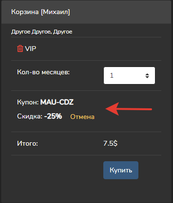 7. Количество активаций купона может быть ограниченным (например 100 активаций), администрация не принимает жлобы, если вы используете купон, лимит активации которого уже исчерпан.