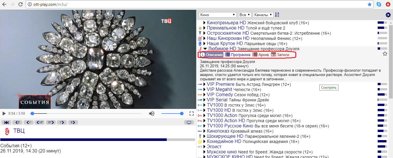 Можно выбирать каналы, просматривать их прямой эфир и архив, пользоваться таймшифтом. Так же в плеере есть удобный фильтр по категориям.