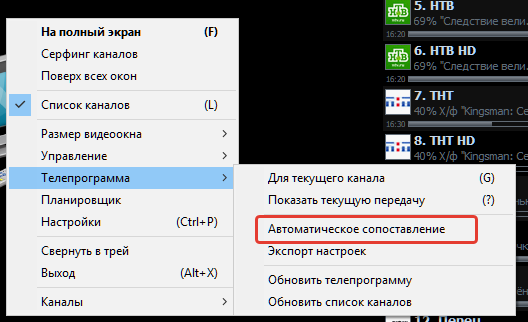 5. Далее вызываем контекстное меню щелчком правой кнопкой мыши по экрану плеера, выбираем пункт "Телепрограмма - Автоматическое сопоставление" и ждем окончания процесса.