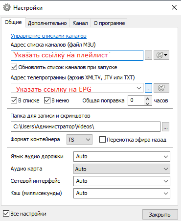 3. После того, как список с каналами прогрузится, нажмите в плеере "Настройки" и в открывшемся окошке поставьте галочку "Все настройки". Программа перезапустится автоматически, и для вас станет доступен более широкий спектр настроек плеера.