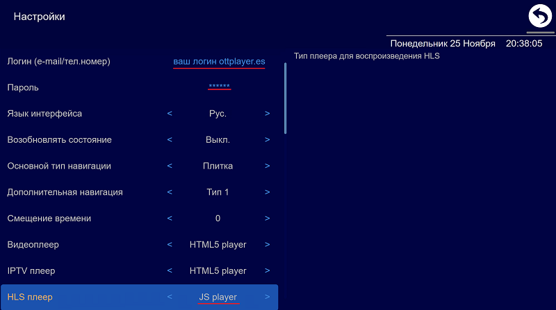 3. В графе HLS плеер выберите - JS Player.