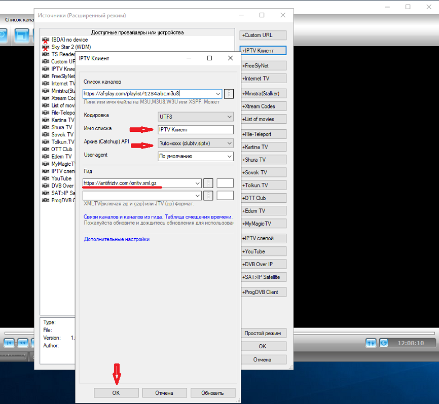 - Список каналов - здесь указываете ссылку на обновляемый плейлист из личного кабинета