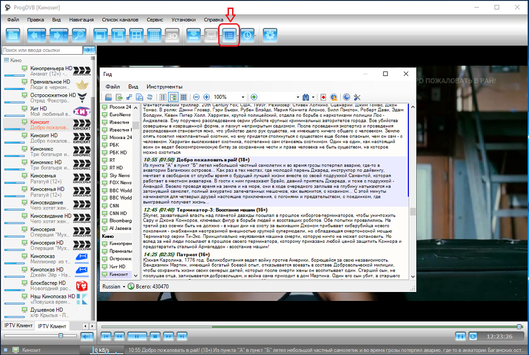 Стоя на канале можно вызвать программу передач и выбрать прошедшие передачи из архива: