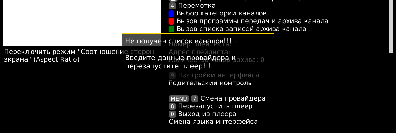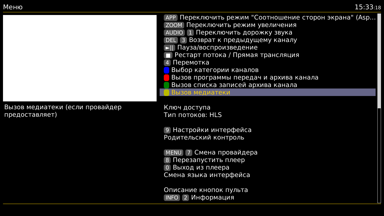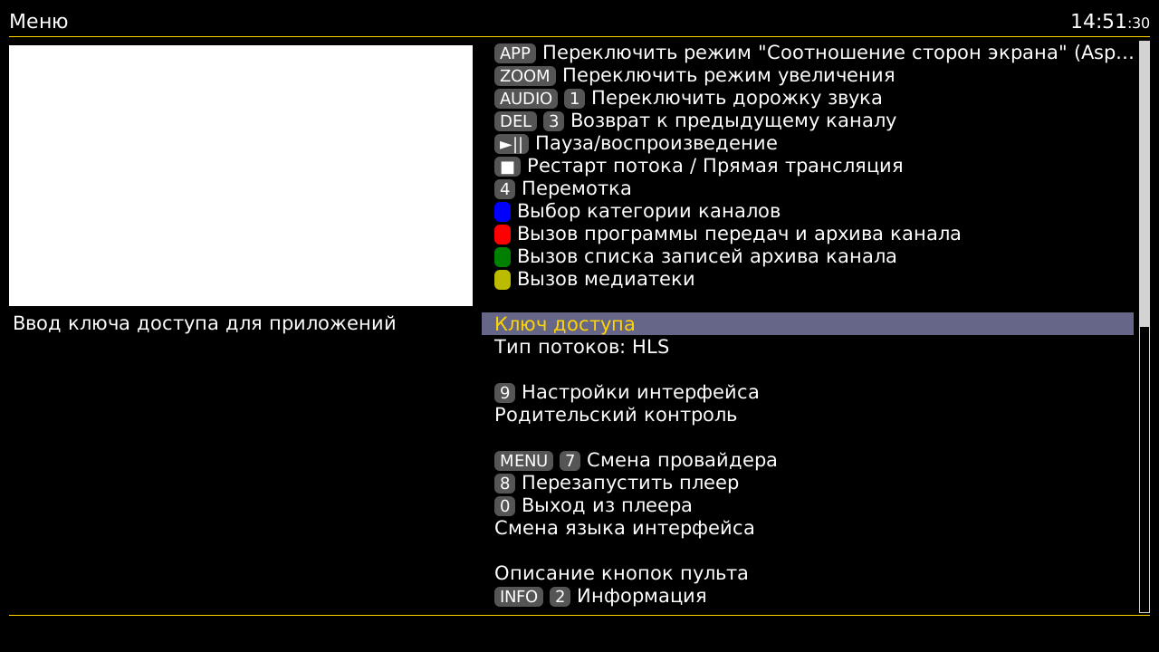 Указываем ключ доступа из личного кабинета. Сохраняем и перегружаем плеер. После перегрузки появится список каналов, с удобной навигацией по списку, категориям и архиву