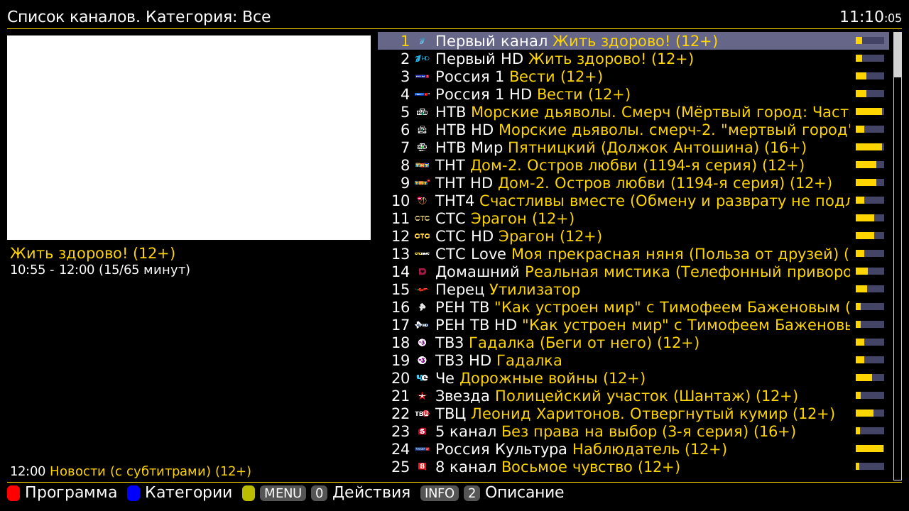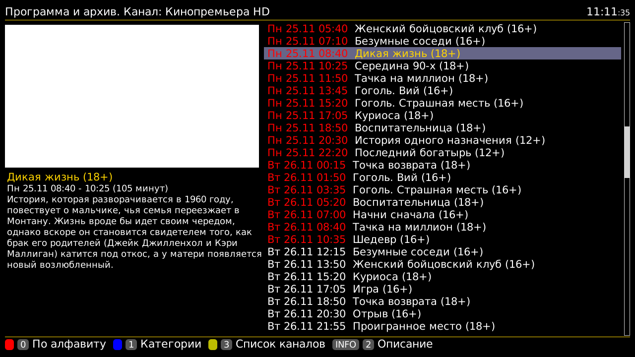 [A] - Вызов списка программ и архива канала (архивы листать вверх и красным выделены)