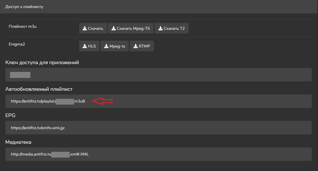Для просмотра прямого эфира и архива воспользуйтесь ссылкой на плейлист. В таком случае у вас будет всегда актуальный плейлист в вашем устройстве. Посмотреть ссылку можно на главной странице в настройках плейлиста.
