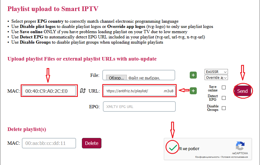Вводим МАС адрес своего устройства и указываем ссылку на плейлист из личного кабинета, а так же проходим капчу и нажимаем отправить ( Send ).