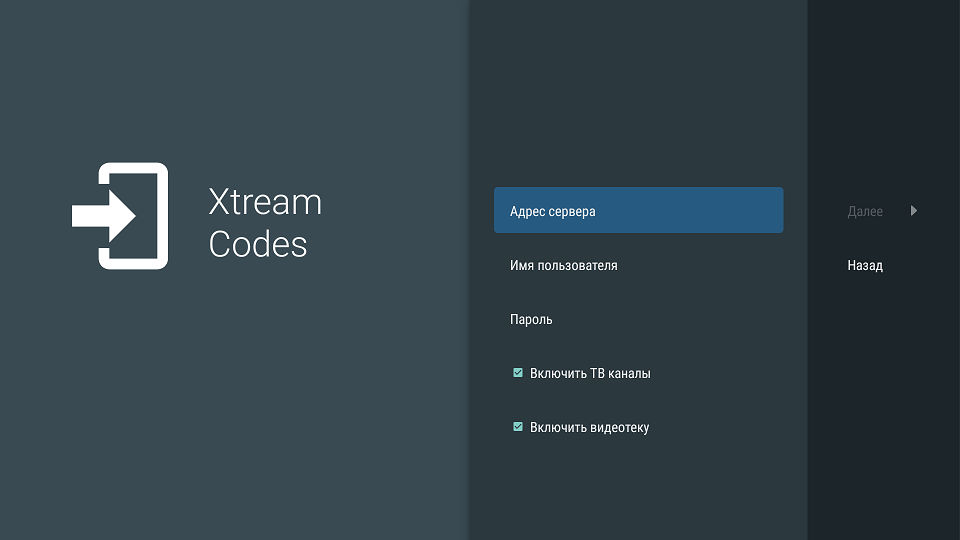 Внимательно перепишите их в соответствующие поля приложения. После того, как вы указали все настройки, нужно убрать виртуальную клавиатуру, ниже в настройках отключить опцию "Включить ТВ каналы", затем нажать Далее
