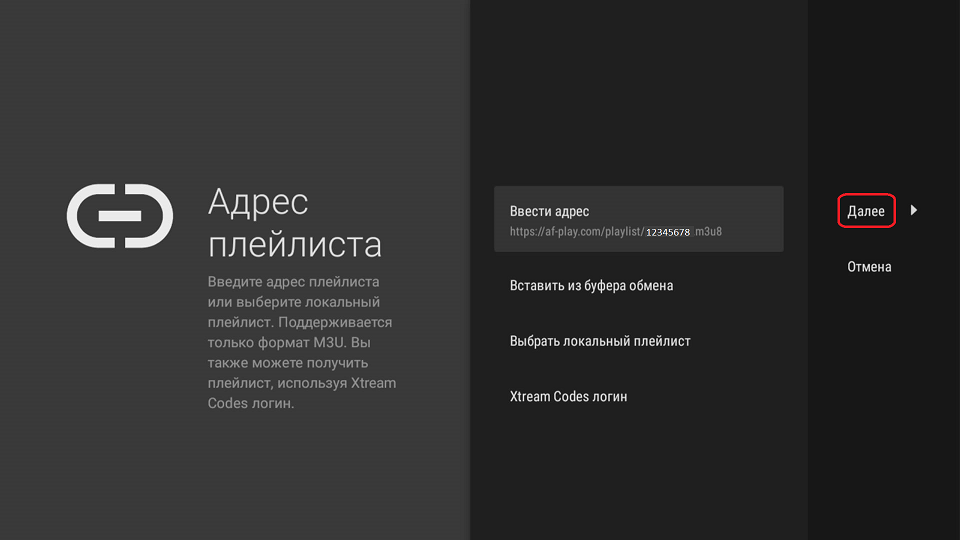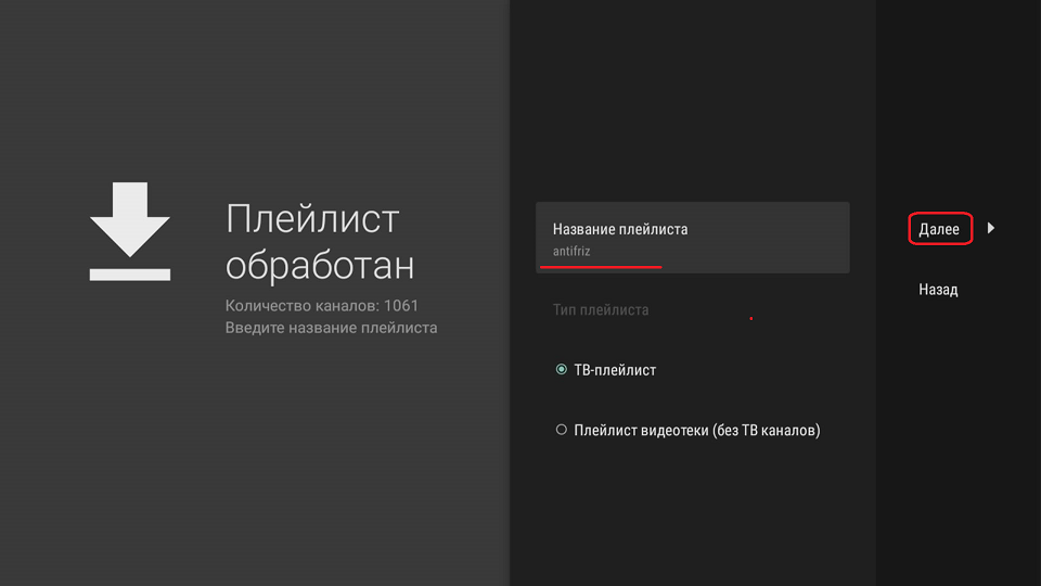 Внимательно ее указывайте в настройках плейлиста в приложении, после чего убирайте виртуальную клавиатуру и выбирайте опцию "Далее"