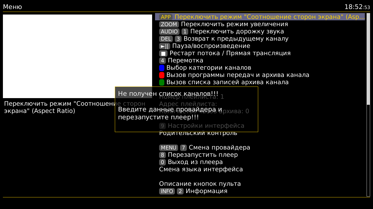 По кнопке "ОК" на пульте убираем предупреждение, в меню выбираем опцию "Смена провайдера"