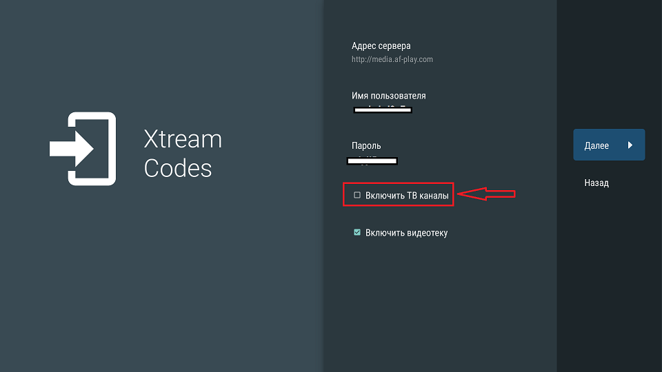 Внимательно перепишите их в соответствующие поля приложения. После того, как вы указали все настройки, нужно убрать виртуальную клавиатуру, ниже в настройках отключить опцию "Включить ТВ каналы", затем нажать Далее